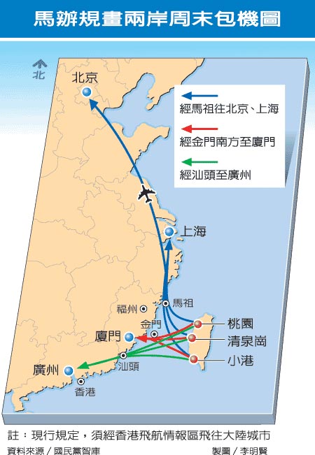 報道稱,為加速兩岸周末包機進程,馬英九昨聽取智庫永續(xù)發(fā)展組召集人陳世圯簡報,就直航時間、航點等細節(jié)交換意見,智庫規(guī)劃兩岸飛行航線采“截彎取直”模式,最多可以節(jié)省近一半的飛行時間,馬當場裁示“積極辦理”。