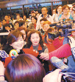 林青霞(左)昨晚返臺(tái)投票,被大批媒體包圍。(臺(tái)灣《聯(lián)合報(bào)》圖)