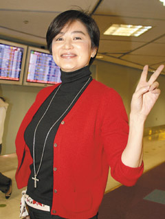 林青霞身上穿著和前一天晚上現(xiàn)身機(jī)場(chǎng)很類(lèi)似,依舊紅外套配黑衣黑褲,她說(shuō)是討吉利,象征她所支持的人一定能當(dāng)選。