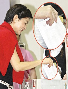 她氣得大叫:“沒人告訴我啊,我真不知道,看到紅色印泥直覺就是要蓋私章啊!彼f,四年前“大選”她也誤投了廢票(《聯(lián)合報》編按:依該報資料相片,四年前林青霞是用投票圓戳章,沒用錯)。