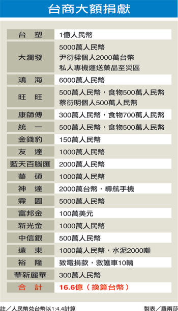 至昨天為止,臺灣企業(yè)及企業(yè)主承諾捐款金額已突破二十億新臺幣,創(chuàng)臺商對大陸單一天災(zāi)捐款紀錄。