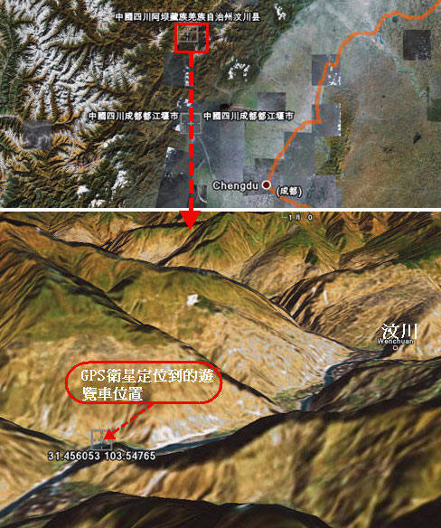 中新網(wǎng)5月16日電 四川地震后,臺(tái)灣彰化祥鶴旅行社一行14人行蹤成謎。據(jù)臺(tái)灣《聯(lián)合晚報(bào)》報(bào)道,透過(guò)團(tuán)員搭乘的游覽車上的GPS定位系統(tǒng),確定了游覽車的經(jīng)緯度,在汶川鐵礦附近。目前人在四川的旅行社總經(jīng)理陳文義已將定位的位置交給當(dāng)?shù)氐木葹?zāi)指揮中心,希望能夠優(yōu)先搶救,盡速把年事已高的團(tuán)員們找到。