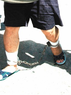 據(jù)稱,綠島監(jiān)獄規(guī)定所有新收受刑人從入獄當天起得戴腳鐐三個月,表現(xiàn)好才解除,因腳鐐皆生銹,常有受刑人的腳磨破,細菌感染得到蜂窩性組織炎,腿腫得跟象腿一般,申請到臺灣就醫(yī),機票及醫(yī)藥費還得自付。