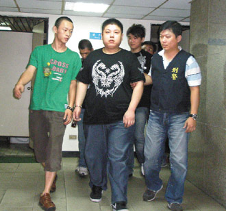 臺北市警方逮捕涉嫌擄人凌虐強索遮羞費的惡煞,其中嫌犯林楓杰(中)還逼被害人吞下兩顆子彈,手段兇殘。 (圖片來源:臺灣《聯(lián)合報》)