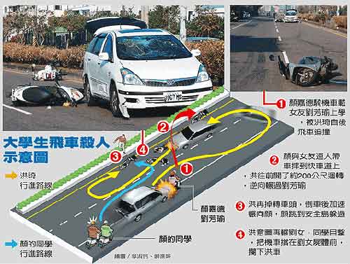 中新網(wǎng)12月19日電 據(jù)臺灣《聯(lián)合報》報道,臺灣臺南縣致遠(yuǎn)管理學(xué)院大三學(xué)生洪琦不滿女友分手,昨天駕車尾隨情敵顏嘉德與前女友劉芳瑜的摩托車,撞倒兩人后,再回轉(zhuǎn)輾過前女友,致前女友當(dāng)場慘死。