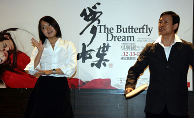 中新網11月2日電 據“中央社”報道,臺灣當代傳奇劇場新創(chuàng)昆曲風歌劇《夢蝶》十二月十三至十六日將在戲劇院演出。在昨天的記者會中,作為男女主角的京劇名角吳興國(右)與昆曲名伶錢熠(左)現(xiàn)場表演一段“搧墳女與莊周”。