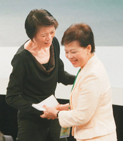 二00八年臺(tái)灣地區(qū)領(lǐng)導(dǎo)人選舉候選人第二場(chǎng)電視辯論會(huì)昨天舉行,馬、 謝辯論之前,馬英九夫人周美青(左),特地走向謝長(zhǎng)廷夫人游芳枝(右)致意。臺(tái)灣《聯(lián)合報(bào)》圖 黃義書(shū) 攝