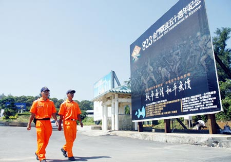 金門八二三炮戰(zhàn)五十周年即將到來(lái),臺(tái)灣軍方和金門縣政府合辦系列紀(jì)念活動(dòng),并在“小三通”水頭港區(qū)布置巨幅看板,提醒“戰(zhàn)爭(zhēng)無(wú)情、和平無(wú)價(jià)”。圖:“中央社”