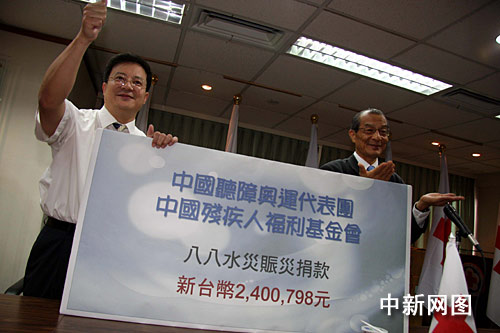 在簡短的捐贈儀式上,中國聽障奧運代表團團長賈勇表示,這次前來臺北參加第二十一屆聽障奧運會,借此機會,他代表中國聽障奧運代表團和中國殘疾人福利基金會,向“八八水災”罹難的同胞們捐款。希望為受災同胞加油,災區(qū)重建工作盡快回復。同時希望擴大包括運動員在內的兩岸交流,增進彼此了解,共同抗擊自然災難。