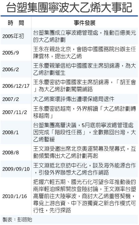 “大乙烯計(jì)劃”原是臺(tái)塑寧波石化的二期專(zhuān)案,包括年產(chǎn)1,000萬(wàn)噸的煉油、年產(chǎn)120萬(wàn)噸的乙烯裂解廠(chǎng),60萬(wàn)噸的丙烯廠(chǎng)、16.7萬(wàn)噸的丁二烯廠(chǎng),以及芳香烴系列,投資總額是100億美元,是臺(tái)塑集團(tuán)創(chuàng)辦人王永慶先前積極推動(dòng)的登陸投資案。
