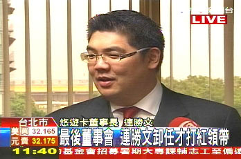 中新網(wǎng)5月27日電 據(jù)臺(tái)灣TVBS電視臺(tái)報(bào)道,悠游卡公司董事長(zhǎng)連勝文,因?yàn)榻】翟蛘?qǐng)辭,今天是最后一次主持董事會(huì),主持的是自己與新董事長(zhǎng)劉奕成的交接,連勝文特別打上紅領(lǐng)帶,笑說(shuō)自己任職1年9個(gè)多月,今天第一回挑紅色,因?yàn)閷?shí)在太開(kāi)心了。