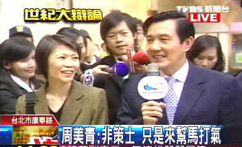 此次辯論會(huì),周美青一樣參與了討論,也一樣非常地嚴(yán)格。她建議馬英九,多說(shuō)一些小老百姓日常生活關(guān)心的話題,講述過程要簡(jiǎn)單,賣弄文字得避免,最重要的是不可長(zhǎng)篇大論。當(dāng)記者詢問選戰(zhàn)是否應(yīng)偏向政策討論勝于口水戰(zhàn),她回答馬一直都沒打口水戰(zhàn)。