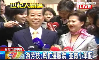 據(jù)“中央社”報(bào)道,民進(jìn)黨候選人謝長(zhǎng)廷穿上游芳枝挑的深藍(lán)色西裝、黃色領(lǐng)帶,看起來(lái)相當(dāng)有精神。游芳枝也幫謝長(zhǎng)廷貼心記了許多小筆記,寫在小卡片上。