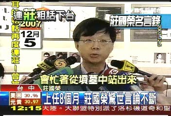 中新網(wǎng)3月17日電 臺當(dāng)局“教育部”主任秘書莊國榮辱罵馬英九父親馬鶴凌,昨晚已經(jīng)為此下臺。據(jù)臺灣TVBS報道,莊國榮2007年8月1日以“法學(xué)專家”出任臺“教育部”主秘,語出驚人的風(fēng)格為他在8個多月的任期中留下不少“驚世言論”。