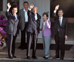 馬英九、蕭萬長27日下午4時(shí)半抵達(dá)李登輝寓所翠山莊。李登輝和夫人曾文惠在門口迎接馬蕭,四人臉上堆滿笑意。李登輝、馬英九主動(dòng)向守候媒體揮了揮手,隨后一起走進(jìn)屋內(nèi)。