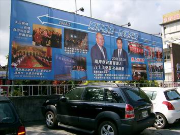 中新網(wǎng)8月28日電 據(jù)臺灣“中廣新聞”報道,國民黨臺東縣黨部27日在大門前懸掛黨主席吳伯雄與中共中央總書記胡錦濤握手的照片,以及訴求主題為“兩岸關系、雨過天青”的巨幅文宣廣告牌,相當引人注目。