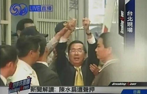 臺(tái)灣“今日新聞”報(bào)道說,陳水扁下午4時(shí)30分許步出特偵組準(zhǔn)備上車時(shí),面對(duì)媒體高舉銬著手銬的雙手,喊完口號(hào)才上車,一副從容就義的模樣,顯然有備而來(lái)。