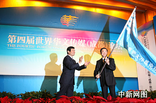 圖為世界華文傳媒論壇會旗交接儀式,成都市委常委、宣傳部長郝康理先生向上海市政府代表崔明華先生交接會旗。