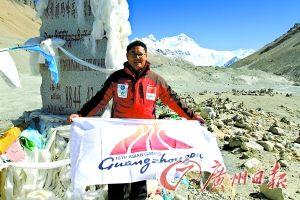 從廣州到溫哥華再到珠穆朗瑪峰,8個月的時間,上萬公里的路程,這幅肩負著廣州亞運會宣傳任務(wù)的旗幟終于飄揚在了珠峰。
