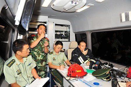 指揮人員在指揮車(chē)內(nèi)指揮滅火