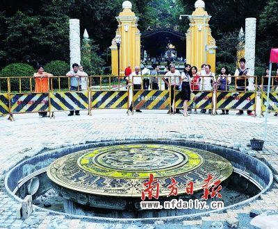 據(jù)介紹,原點標(biāo)志表面微凸,高出地面15厘米,直徑3米。標(biāo)志物外圍采用灰、黑兩色花崗巖作襯邊,沿放射線方向鑲嵌銅條,花崗巖表面陰刻了廣州建城歷史簡記。內(nèi)側(cè)圓盤采用2厘米厚的黃銅板和巴西水晶石制成,重達3噸,圖案取材于南越王墓出土的“龍鳳玉佩”和“羽人駕舟”浮雕圖案,彰顯了嶺南文化特色。