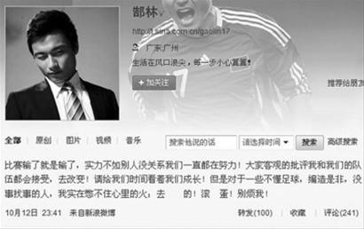 國(guó)足12日輸球后,郜林發(fā)布的微博截屏。