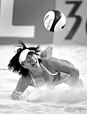 亞運(yùn)會(huì)沙排半決賽,中國(guó)選手張希飛身救球,她和搭檔薛晨晉級(jí)決賽。新華社發(fā)