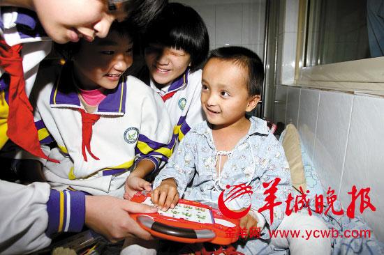 6歲的小華琛坐在兒童醫(yī)院的病床上,雙腳打著石膏———這是他第三次打石膏做矯正。他從小失去父母,又患有先天性馬蹄內(nèi)翻足,性格內(nèi)向。不過,來廣州近一個(gè)月的日子,他不斷被熱心人改變著。1日,廣州市第13中學(xué)8名學(xué)生代表也來到兒童醫(yī)院探望小華琛(見右圖)。