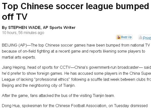 美聯(lián)社文章稱(chēng),中國(guó)足球的頂級(jí)聯(lián)賽已經(jīng)被“踢出”國(guó)家電視臺(tái)的節(jié)目單,因?yàn)樽罱舆B不斷的球場(chǎng)暴力,在媒體報(bào)道中甚至被稱(chēng)作“武術(shù)選手”。文章援引了央視體育頻道總監(jiān)江和平的說(shuō)法稱(chēng),他更希望播出外國(guó)的體育節(jié)目!白罱谐(lián)賽非常混亂,有一些球員缺乏職業(yè)素質(zhì),”他指的是上周北京國(guó)安和天津泰達(dá)隊(duì)的比賽中,兩隊(duì)球員爆發(fā)了群毆事件,賽后一些球迷還襲擊了客場(chǎng)作戰(zhàn)的天津隊(duì)的大巴。