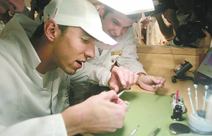 8月18日,菲爾普斯與世界最頂級的游泳運動員共同在朝陽公園的草地上吃午餐,陽光刺眼,他卻獨自躺在躺椅上享受日光浴。休息片刻,他站起身,漫不經(jīng)心地拿起一罐可樂,一仰脖喝了下去,隨后,大口吃著肉串,不時和旁邊的姑娘們說笑著,而近在咫尺就是黑壓壓的一片鏡頭群,“Michael……Michael”此起彼伏的喊聲中,他扭過頭來笑笑,端著盤子走近圍欄邊。面對“圍困”的場面,菲爾普斯似乎并沒有太多不適,也不曾“黑面”,總是隨心所欲地嬉鬧。休息時,大腳趾吊著涼拖,繞啊繞的,很悠閑。