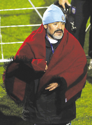 當阿根廷隊剛剛結(jié)束訓練,馬拉多納一行正要返回更衣室,這時兩個來自薩爾塔市(布宜諾斯艾利斯以北的小城)的阿根廷記者走了過來向老馬講述了他們長途跋涉帶來禮物和祝福的故事,馬拉多納本來是快步走向更衣室的,聽到記者的故事立刻停了下來。“這是來自San Antonio de Los Cobres,一個海拔4000米小城孩子們的禮物,他們托我們?yōu)槟銕砹颂鹤!甭牭竭@里馬拉多納的真性情顯露無遺,接過毯子立刻披在了身上。這個被提到的小城叫做 San Antonio de los Cobres,距薩爾塔市約180公里,距布宜諾斯艾利斯約1750公里,海拔高達4000米,那里的球迷無法通過電視來觀看世界杯的比賽,但是他們一樣喜歡馬拉多納,關(guān)注阿根廷隊。許凱 黃啟元 本報南非專電
