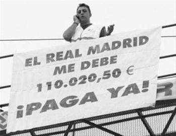 為了從皇馬俱樂部手中拿到這筆工程款,馬修鋁業(yè)公司老板卡洛斯·馬特奧不得不登上起重機上到高空,并貼出討債大字報,他希望通過這種方式引起全西班牙的關注,并逼迫皇馬盡早支付這筆款項。