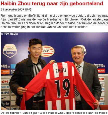 周海濱是今年2月份正式登陸PSV,并在2月17日的一場預備隊比賽中登場。雖然未能和周海濱續(xù)約,但PSV官網(wǎng)上還是對其贊賞有佳:“周海濱是PSV歷史上第二名中國球員,首位中過球員是孫祥,他也是第一個在歐冠賽場上登場的中國人。雖然周海濱沒有獲得這也的機會,但他仍然創(chuàng)造了一個記錄——他是第一個在PSV一線隊進球的中國球員,不過很遺憾他沒有代表PSV參加過正式比賽!