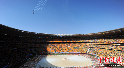 中新網(wǎng)6月11日電 隨著羅伯特凱利演唱起本屆世界杯主題曲《勝利的召喚》,南非世界杯開幕式正式落下了帷幕。一個(gè)多小時(shí)之后的22:00,本屆世界杯的揭幕戰(zhàn)就將在這個(gè)體育場(chǎng)打響,東道主南非隊(duì)將迎來(lái)小組賽的首個(gè)對(duì)手、中北美勁旅墨西哥。