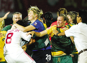 人在足球場(chǎng),女子也瘋狂!8月3日晚上的武漢漢口體育場(chǎng),在亞青賽中國(guó)隊(duì)與澳大利亞隊(duì)的比賽結(jié)束之后,溫文爾雅的女孩們也動(dòng)起了老拳,場(chǎng)上三四十人亂戰(zhàn)成一團(tuán),經(jīng)過亞足聯(lián)官員長(zhǎng)達(dá)十分鐘的調(diào)解,事態(tài)才暫時(shí)得到平息。然而,心懷不滿的澳大利亞女足姑娘們,還意猶未盡,在回到更衣室后,她們瘋狂地拆卸了更衣室的衣柜,砸成一團(tuán)。而她們的教練也按捺不住心中的憤懣,在發(fā)布會(huì)上當(dāng)著眾多記者面,砸掉了手中的礦泉水瓶,險(xiǎn)些砸到一名中國(guó)記者。一場(chǎng)普通的比賽,以這樣的方式收?qǐng)觯磥,足球之亂,并非只在中國(guó)球員身上,也并非只是成年隊(duì)球員。