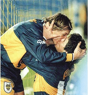 阿根廷人的豪放這一刻展現(xiàn)得淋漓盡致,主角是球王和風(fēng)之子。當(dāng)時風(fēng)之子接到球王的妙傳破門得分,兩個人當(dāng)場不顧全場所有觀眾和其他的隊友激吻在一起,長達(dá)6分鐘,而且還是“舌吻”!當(dāng)時引起了全世界的轟動!好戲還在后頭:卡尼吉亞的老婆說:“馬拉多納是同性戀,他喜歡親吻卡尼吉亞的嘴唇!碑(dāng)然老馬很生氣,但是他表示:“看在卡尼吉亞的份上就不追究了!”