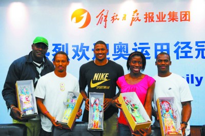 座談會(huì)上,還有北京奧運(yùn)會(huì)男子4×100米冠軍成員,牙買(mǎi)加隊(duì)的弗雷德和卡特,北京奧運(yùn)會(huì)女子400米金牌獲得者奧古魯格,雅典奧運(yùn)會(huì)和北京奧運(yùn)會(huì)兩屆女子三級(jí)跳冠軍姆邦哥。他們和奧利弗,都是第一批抵達(dá)上海參加黃金大獎(jiǎng)賽的運(yùn)動(dòng)員,此次受到解放日?qǐng)?bào)報(bào)業(yè)集團(tuán)和解放日?qǐng)?bào)領(lǐng)導(dǎo)的熱忱接待,并因收到了如穆桂英、孫悟空、趙云等京劇人偶,以及中國(guó)筷子等極具中國(guó)特色的禮物,而充滿驚喜。