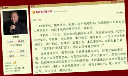 8月4日凌晨,針對德云社弟子打人事件,郭德綱在其博客上發(fā)表一篇《有藥也不給你吃》的文章,字句相當犀利。網(wǎng)友看后紛紛調(diào)侃:“天不怕,地不怕,就怕流氓有文化!”