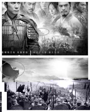 在這款《赤壁》內(nèi)地版橫版海報(bào)上,片中主要角色周瑜、諸葛亮、小喬、孫尚香都在海報(bào)上各居其位,海報(bào)右下方看上去是影片中的某個(gè)場景:一班全副武裝的戰(zhàn)士沿江而行,不遠(yuǎn)處狼煙滾滾。如果你在為這張海報(bào)的氣勢恢宏嘖嘖稱贊的時(shí)候,再把那張電影《300勇士》的海報(bào)放在一起比較,就會發(fā)現(xiàn)這張海報(bào)和《赤壁》的三處畫面“如出一轍”,除了戰(zhàn)士的裝束不同,背景略有差異,其他方面幾乎一模一樣。