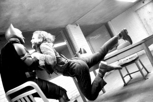 還是在審問(wèn)期間,“蝙蝠俠”和“小丑”互相糾纏在一起,前者的雙手掐住了后者的頭頸。當(dāng)時(shí)采取了不同機(jī)位拍攝特寫(xiě),從一個(gè)角度來(lái)看,“小丑”從“蝙蝠俠”的手臂下方抓住他,但從另一個(gè)角度來(lái)看,“小丑”的手臂卻占據(jù)了上風(fēng),搭在“蝙蝠俠”手臂之上。
