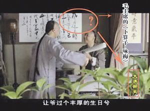 近日,央視國際頻道播放的古裝電視劇《大清御史》里,毛澤東的詞《卜算子•詠梅》居然懸掛在清朝乾隆年間的官員錢灃的書房里。(3月29日《揚(yáng)子晚報(bào)》)