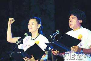昨晚的演出中,多個名為“故事講述”的節(jié)目成為主角,它們分別由著名演員或相聲名家演繹。蔣雯麗講述了一個母親為了保護自己三四個月大的孩子,被垮塌的樓房壓死,臨死前還在手機里寫下短信:“孩子,你要活著,你一定要記住,媽媽愛你”;鞏漢林金珠夫婦則抒發(fā)了對祖國的深情:“愛心永駐汶川。五月的中國,你讓世界驚嘆”;朱時茂和王思懿則形成組合,朗誦《流淚后我們選擇堅強》。此外,相聲名家姜昆則以《我們選擇堅強》為題,高聲說:“中國不哭,我們不哭!站起來,我們?yōu)槟銚纹鹨黄{天!彼猩婕叭宋锏墓适氯钦嫒苏媸,這些故事讓現(xiàn)場的觀眾非常感動。