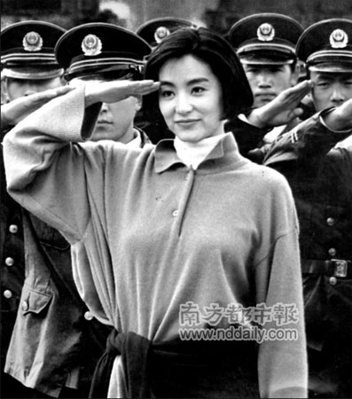 敬禮姿勢,盡顯青春英氣。林青霞與武警戰(zhàn)士在一起。(樊甲山攝)