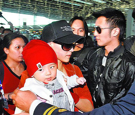 張柏芝(中)4月帶兒子赴泰國探謝霆鋒(右),3人搭機返港。