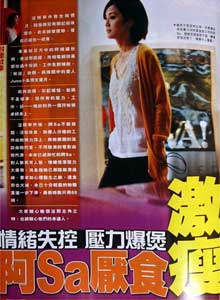 據(jù)《聯(lián)合晚報》報道,最新一期《3周刊》以“情緒失控 壓力爆煲 阿Sa厭食激瘦”為題,指阿嬌休假與愛人麥浚龍預支蜜月,剩下阿Sa一人扛起全部壓力和工作,使其情緒低落壓力大爆發(fā),剩下88磅體重,健康告急。