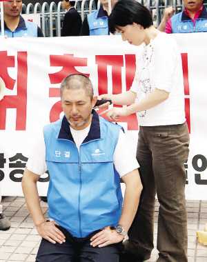 擁有大量歌手、演員的韓國廣播電影演出藝人工會(簡稱藝人工會)昨天10時在文化放送電視臺(MBC)門前舉行游行示威,逾300名工作人員舉牌要求MBC就員工薪水問題做出確切回應(yīng),藝人工會委員長金應(yīng)錫更跪地削發(fā)表決心,誓要討回公道。