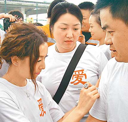 至下午3時(shí)多,他們到成都一間消防局為數(shù)百名消防員打氣,他們是首批進(jìn)入災(zāi)區(qū)徒手在瓦礫中救出幾百名傷者的英雄,華仔和Sammi帶頭向這班消防英雄敬禮。Sammi說:“第一隊(duì)人入災(zāi)區(qū)以血汗救人,這些人是真英雄。”華仔則說:“5.12地震發(fā)生后,我先知道內(nèi)地消防員是這樣,她們不顧自己安危,我真是好敬佩。”