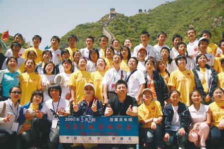 29日,羽·泉與來自北川中學的44名學生在長城腳下大喊“中國加油”,表達重拾信心,努力學習,重建家園的決心。(關力制)