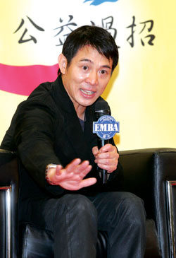 中新網(wǎng)6月3日電 據(jù)臺灣“東森新聞”報(bào)道,功夫巨星李連杰這次到臺灣不宣傳電影,他推廣的是一元行善;2日晚間他走進(jìn)政大EMBA講堂,在臺灣的企業(yè)精英和教授面前,足足說了兩個(gè)小時(shí),而且他有問必答,風(fēng)趣的言談成功的把一元行善的想法,介紹給在場的政大師生。