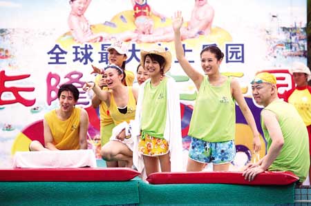 昨天下午,天公不作美,一直下雨,但這絲毫不影響“龍?zhí)印钡呐d致,房祖名率領(lǐng)愛戴、Sara來到廣州長隆水上樂園拍湖南衛(wèi)視游戲節(jié)目《勇往直前》。雖然冒著雨,但房祖名玩得非常開心,一會大試飛腿踢足球,一會玩垂直滑道,一會更是“嘲笑”對手郭冬臨又胖又笨掉下水,為了贏比賽,房祖名更是把韓國美女Sara的膝蓋弄傷了,淚灑水上樂園。